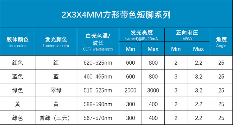 AG恒峰光电2×3×4mm 方形带色短脚直插LED灯珠(红发红、绿发绿、蓝发蓝) 是一种 高色彩纯度、短引脚DIP LED